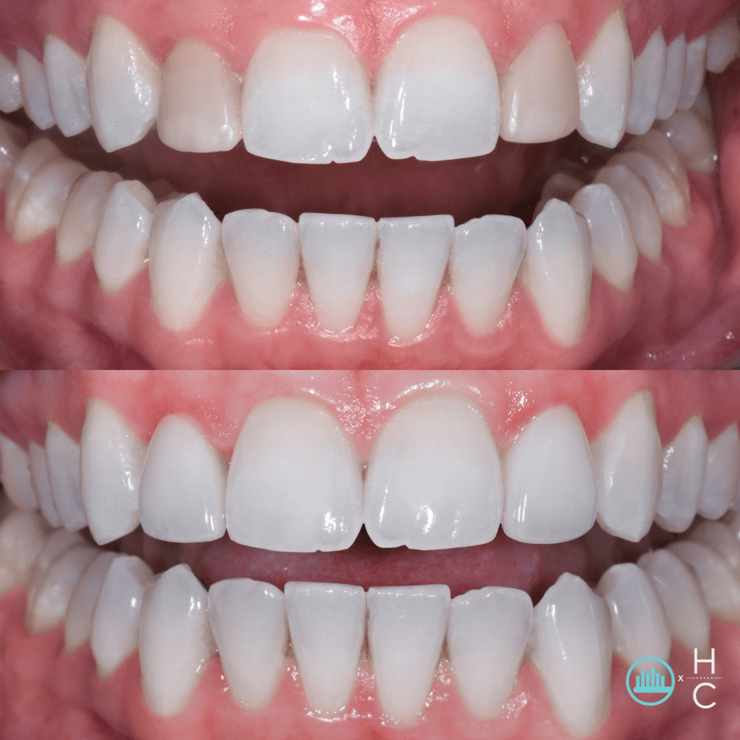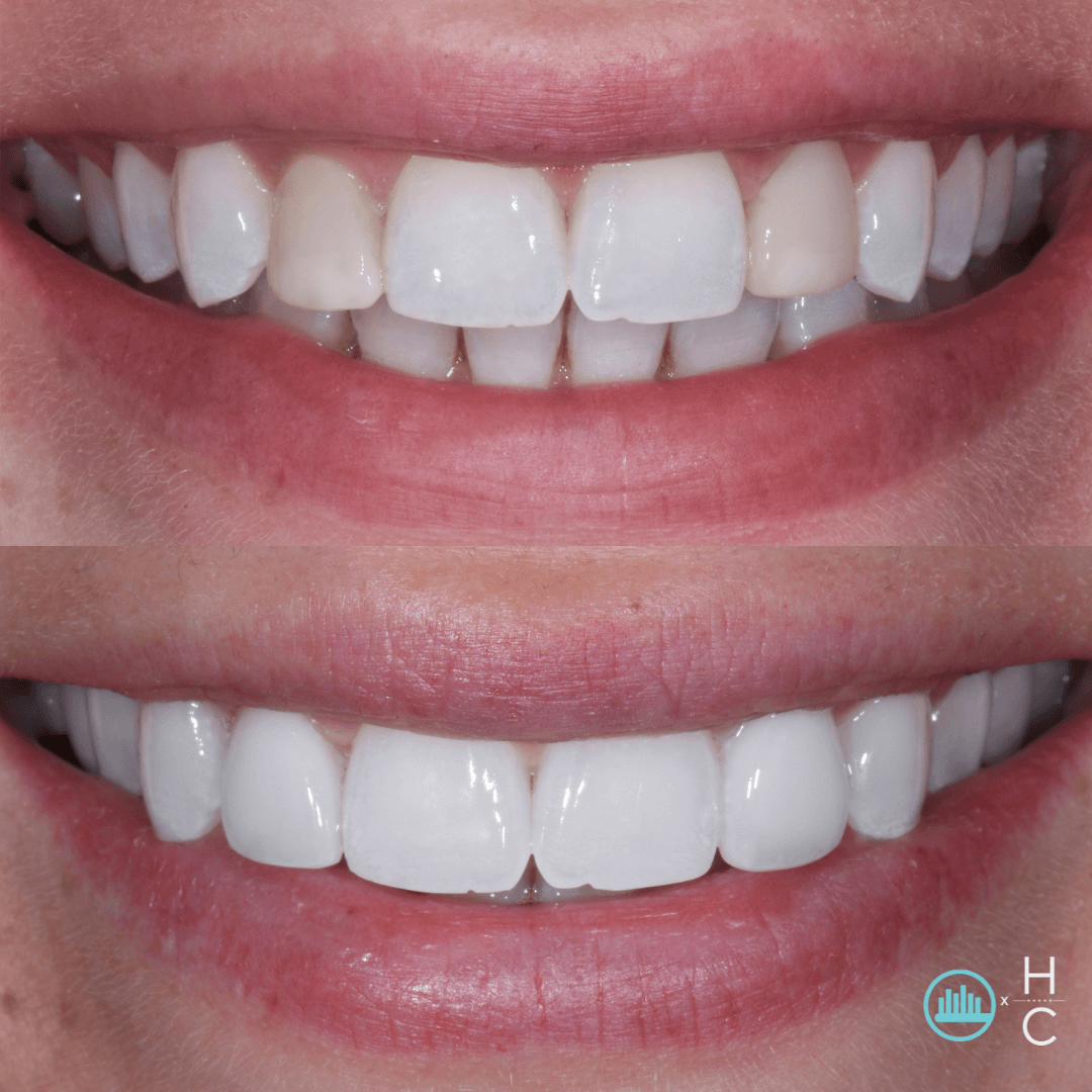 We started with professional whitening to brighten her full smile, then replaced the old composites with custom ceramic veneers that blend seamlessly.